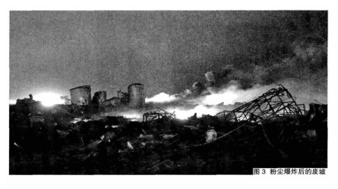 看完上面的內容后,我們來看一下美國威斯威科市糧庫的爆炸原因:威斯威科市糧庫有著幾十個高大的貯糧倉。面粉入庫時,要經過提升塔從平地提升到高處,再由皮帶運輸機分配到各貯糧倉去。那天中午,一批面粉正在進倉,提升塔的皮帶運輸機“吱吱”地響著,源源不絕地將面粉送入。長時間運行的皮帶運輸機在運轉中因為摩擦生熱,引起面粉粉塵著火,緊接著就形成了爆炸。那大朵蘑菇狀的煙云,乃是大量面粉粉塵受到爆炸的激蕩而形成的。這次爆炸,炸死了36人,重傷9人,有48個貯糧倉的大糧庫被夷為平地,連附近的一座辦公樓也徹底炸毀。聞此兇信的人們不禁為之咋舌:小小粉塵發起脾氣來竟是這樣的厲害!(圖3)