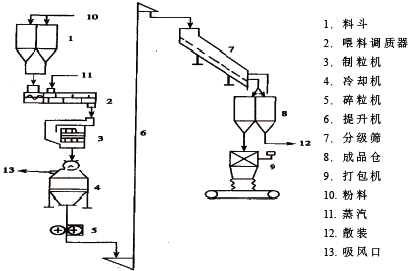 現在較常見的顆粒飼料生產工藝流程,是由前處理(喂料、調質、磁選)、制粒及后處理(冷卻、破碎、 分級等)三大部分組成(見下圖)。這三部分互相制約,決定著顆粒飼料的加工質量和經濟性。