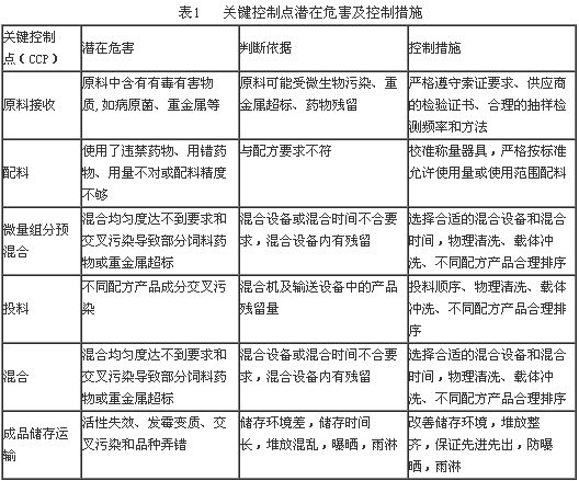 根據以上對預混合飼料加工過程各環節危害分析的結果及關鍵控制點的確定原則,采用關鍵控制點判斷樹的方式,確定原料接收、配料、微量元素預混合、投料、混合、成品貯存運輸作為關鍵控制點,各關鍵控制點存在的潛在危害及控制措施見表1。