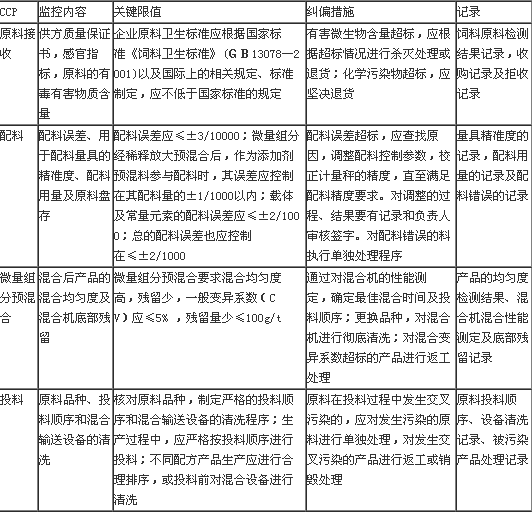 根據分析結果,制定預混合飼料的HACCP計劃工作表(見表2)。