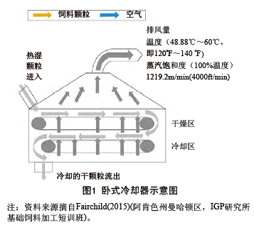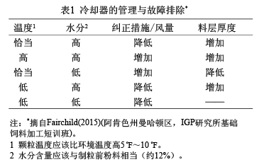 冷卻和干燥是通過流經(jīng)飼料顆粒的氣流完成,空氣通過蒸發(fā)和對流的方式將顆粒表面的水分和熱量帶走。因此,為了讓顆粒中心的熱量和水分有足夠的時間遷移到表面并被氣流帶走,顆粒在冷卻器中要有充足的滯留時間,這很重要。