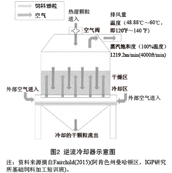 在逆流冷卻器(Couterflow Cooler)中,飼料顆粒在向下流動過程中與較冷的氣流逐漸接觸而被冷卻。當空氣從飼料顆粒床由下向上流動時,空氣被加熱,持水能力不斷增加。這種設計也意味著進入冷卻器的顆粒最先與最熱的空氣接觸,這就減緩了溫度對顆粒的沖擊。溫度沖擊能破壞毛細管作用,降低顆粒中心水分向表面遷移的速率,導致顆粒表面產(chǎn)生應力裂紋。