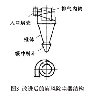 這種新型旋風除塵器在結構相主要改進如下:①進口管下斜5o-10o,使氣流在旋轉的同時保證了向下的旋轉。并且下傾角確保了塵粒反彈時絕對折射朝下。向下旋轉,引起除塵器頂部倒空形成上渦旋氣流產生頂部灰環,灰環沿著排氣管道外表面旋轉向下時,會在排風管入口處與已凈化廢氣的上旋氣流混合,而后經排風管排出除塵器。②進口管采用180o的半圈螺進筒后才旋轉,而改進型則是確保塵氣調整旋轉起來后才進筒。③進口螺旋道截面遞減,增大了氣流旋轉起來后離心力。含粉塵的氣體在螺旋道中實現1.4倍加速。提高了塵粒的慣性,降低了塵粒沉降的時間。④錐體長度加長并采用200小錐角,增加了氣流在分離器中的停留時間,有利于小顆粒的沉降完全,且使向下旋轉的氣體平緩地轉變成折轉向上的旋轉,從而使除塵效率得以提高。⑤除塵器下設緩沖料斗,有效改善廢氣在筒體內的流動工況,減少了灰斗的反混現象和下灰環可能產生的二次揚塵。⑥出風管增長,直到螺旋軌道的底部,防止了內側部分塵粒裹進出風管。⑦進口、加速段、出口的截面積之比擴大為1:0.7:2,即出口網速是進口速度的一半;出口風速是內部加速段的1/3。改進型除塵器粒子的離心力比在傳統型除塵器中的離心力增大了1.4倍以上。而出口處,負壓對粒子的吸力比傳統型約小了1/4。因此,氣流進筒后,塵粒因慣性大,使得稍小些的顆粒在氣流在旋風除塵器中停留時間內也能得到分離。出風網速降低,也使得部分細小的顆粒能擺脫上升氣流的吸力而有機會沉降下來,從而使其分享。