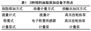 飼料油脂添加設備按計量方式可分3種,流量計計量式、稱重計量式和計量泵計量式。這3種飼料油脂添加設備工作原理大部分是相同的,都是由源油及過濾部分、源油輸入部分、油量計量、油輸出加壓、壓縮空氣過濾調壓和油氣混合噴涂組成,所不同的是,油量計量、油輸出加壓這兩部分(表1)。