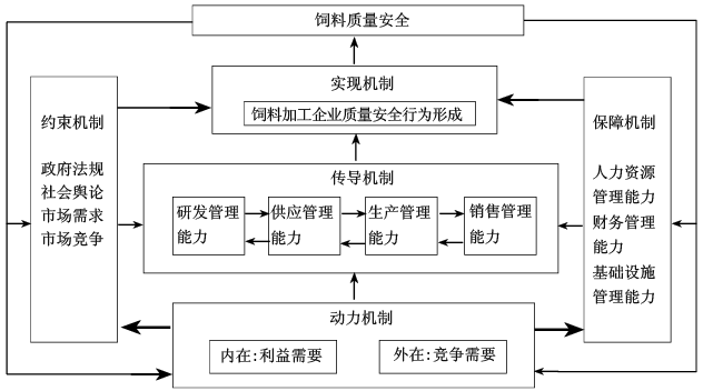 飼料加工企業(yè)質(zhì)量安全行為形成的傳導機制為:(1)研發(fā)管理能力和供應管理能力是基礎(chǔ),對標準選擇、合作對象選擇和投入品管理等過程前質(zhì)量安全行為產(chǎn)生影響;(2)生產(chǎn)管理能力是核心,對過程中質(zhì)量安全行為產(chǎn)生影響,合作、監(jiān)管和加工管理等過程中質(zhì)量安全行為產(chǎn)生影響;(3)銷售管理能力是保障,對銷售、問題識別糾正和責任承擔等過程后的質(zhì)量安全行為產(chǎn)生影響;(4)研發(fā)管理、供應管理、生產(chǎn)管理和銷售能力間具有明顯的聯(lián)系性,生產(chǎn)管理能力建立在研發(fā)管理和供應管理能力的基礎(chǔ)上,并通過問題反饋促進研發(fā)管理和供應管理能力提高,銷售管理能力能夠發(fā)現(xiàn)飼料質(zhì)量安全問題,并通過飼料檔案和責任追溯提升研發(fā)管理、供應管理和生產(chǎn)管理能力。